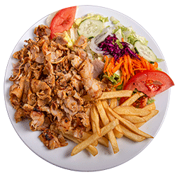 Kebabkött, Isbergssallad, Tomat, Rödlök, Fefferoni, Röd Kebabsås & Vitlöksdressing.